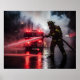 Celebrate the bravery and dedication of firefighters with this dynamic poster. Featuring a firefighter in action with firetruck lights glowing against a dark urban backdrop, this artwork captures courage, urgency, and the spirit of heroism. Perfect for home, office, or fire station décor, and an inspiring gift for firefighters and first responder supporters.