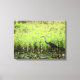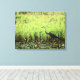 Ein Foto eines Großen Blauen Helden, der durch einen Teich geht. Die Oberfläche des Teiches ist mit Seerosen bedeckt. Der Teich ist von grünen Pflanze umgeben, die an eine Wiese grenzen. Copyright © 2021 Kimberly J Tilley.