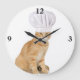 Niedliche orange Katze, die bedacht anstarrt und einen Kochshut, kochfertig Ihre Lieblingsmahlzeit trägt.