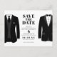 Lass jedem wissen, dass Sie zwei haben sich auf einen Termin für Ihre Hochzeit mit dieser modernen Save the Date Karte mit zwei schwarzen Anzügen. Personalisieren Sie diese, indem Sie Ihre Namen, Datum und Hochzeitsort hinzufügen.