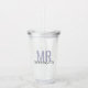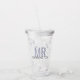 Klare Plastikstrohbecher, personalisiert für ein bevorstehendes Hochzeitsgeschenk oder Jubiläumsgeschenk mit "Mr." in großen Briefen mit eigenem Nachnamen in einem einfachen, modernen und männlichen Schriftart und Hochzeitstag auf der Rückseite. Es ist ein perfekter Brautparty-Sake oder Teil eines koordinierenden Set von Brautparty-Cup Geschenke.