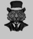 Ein Tiger mit einem aquamarinen Anzug und einem Oberhut, der auf einem abgestuften Hintergrund dargestellt ist, verleiht ein elegantes und skurriles Erscheinungsbild. Das ernsthafte Aussehen des Tieres wird durch die formale Kleidung unterstrichen.