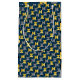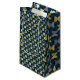 Diese Geschenktasche hat ein modernes Design von Ovalen in der Marine Mitte des Jahrhunderts mit Halbkreisen in Gelb- und Grau-Tönen in ihnen auf einem Feld von schwarz.