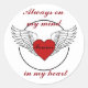 Herz mit Flügeln und Zitat "immer auf meinem Geist ewig in meinem Herzen" Erstellen Sie individuelle Aufkleber für jeden Anlass! Durchsuchen Sie unsere Designauswahl oder laden Sie Ihr eigenes Foto, Logo oder Text hoch. Diese Aufkleber sind in 7 Formen erhältlich, in matt oder glänzend lackiert und mit hochwertigem Vollfarbendruck bedruckt. Sie eignen sich perfekt für alles, von Sondermailings über Scrapbooking bis hin zu Kinderaktivitäten und der Darstellung Ihres persönlichen Stils. Erhältlich in 2 Größen Groß: 3" Durchmesser, 6 Aufkleber pro Blatt Klein: 1,5" Durchmesser, 20 Aufkleber pro Blatt Druck auf säurefreiem Papier Wahl der matten oder glänzenden Oberfläche Mit der Schaltfläche "Anpassen!" können Sie aus 7 verschiedenen Formen wählen Hochwertige, vollfarbige, vollblütige Druckvorn, leicht abziehbare Rückseite