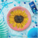 Gelbe Sonnenblume mit herzförmiger Mitte und Ladybug auf rotem und weißem Gingham.