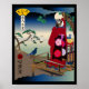 Dieses beeindruckende japanische Holzschnitt-Kunstwerk präsentiert eine moderne Drehung traditioneller ukiyo-e-kunst mit einer siamesischen Katze, die einen luxuriösen, roten Kimono trägt, der mit lebhaften rosa und weißen Blumenmustern auf einem schwarzen sechseckigen Hintergrund dekoriert ist. Die Katze steht kontemplativ auf einer hölzernen Veranda (engawa) und blickt auf einen entfernten Fuji unter einem Vollmond. Die Szene fängt einen ruhigen Moment mit traditionellen japanischen Elementen ein: Kiefern mit Smaragdnadeln, stilisierte Wolken und ein blauer Vogel (möglicherweise eine Mynah), der auf dem Geländer steht. Im Hintergrund hält ein kleiner Tisch eine Schüssel mit Wellenmuster (波), die die japanische Ästhetik ergänzt. Die Komposition umfasst klassische ukiyo-e-Elemente wie den gelben fächerförmigen Cartouche im oberen links, der japanische Schriftzeichen enthält, und ein rotes kreisförmiges Siegel mit Kanji im unteren links. Das Kunstwerk verbindet die raffinierte Eleganz traditioneller japanischer Kunst meisterhaft mit zeitgenössischer Laune durch seinen felinen Protagonisten. Besonders auffällig ist die Farbpalette mit tiefen Rot- und Schwarzwänden des Kimono, die sich wunderbar gegen den subtilen Verlauf des Himmels und das üppige Grün der Kiefernnadeln kontrastieren. Das Gesamtbild schafft eine harmonische Mischung aus klassischer japanischer Kunst und moderner Sensibilität und macht es zu einem anspruchsvollen Stück, das sowohl für traditionelle als auch für zeitgenössische Innenräume geeignet ist. Das Stück bewahrt erfolgreich das Gleichgewicht, die Komposition und die Liebe zum Detail, die für Ukiyo-e-Drucke charakteristisch sind, und stellt gleichzeitig spielerische, zeitgenössische Elemente vor, die es für das moderne Publikum einzigartig attraktiv machen.