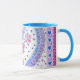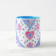 Eine hübsche und romantische Ringer-Tasse mit puderblauer Felge und Griff und einem Design aus rosa und blauen Rose und Herzen, von einem originellen Gouache Gemälde von Judy Adamson. Dieses Design ist auch auf Grußkarten und verschiedenen Geschenken erhältlich.
