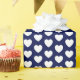 Ein Packpapier mit weißen Herzen auf marineblau Hintergrund. Passen Sie die Hintergrundfarbe unter anderen Optionen an.