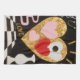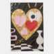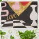 Ein abstraktes, gemischtes Gemälde mit einem großen, strukturierten goldenen Herz in der Mitte, dessen Lichtstrahlen von oben rechts ausgehen. Das goldene Herz besteht aus drei kleineren Herzen in Pastellrosa, lebhaftem Rot und Weiß, letzteres mit einem schwarzen Punkt. Eine weiße, stilisierte Vase befindet sich auf einem Schachbrettboden in der rechten unteren Ecke, während eine ziselig-rosa Linie die links Seite der Leinwand hinaufschlängelt. Das Wort "LIEBE" wird in goldenen Buchstaben in der Nähe des unteren links gestrichen. Der Hintergrund ist schwarz. Das Kunstwerk hat einen kühnen, grafischen Stil mit einem ausgeprägten Sinn für Symbolik, der Elemente von Liebe, Chaos und Ordnung kombiniert.