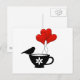 Whimsical Grafik zeigt Teacup und Finch-Silhouette mit roten Herzblasen.