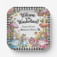 Ein skurriles "Welcome to the Wonderland!"-Zeichen für eine magische 1. Geburtstagsfeier. Die Abbildung zeigt spielerische Zeichen, die von der Alice im Wunderland inspiriert werden, darunter zwei Alices, eine lächelnde gestreifte Cheshire-Katze und Kinder, die aus übergroßen Teetassen austreten. Umgeben von riesigen Pilzen, blühenden Blume und einer schwarz-weiß karierten Grenze lädt dieses hübsche Kunstwerk die Gäste in eine fantasievolle Welt ein, die sich perfekt für ein kleines, eindrucksvolles Party eignet.