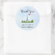 Eine Geburtstagsparty dankt Ihnen für einen Aufkleber mit einem skurrilen zeichn des Eiffelturms im Hintergrund, umgeben von grünen Bäumen. Der Hintergrund ist ein digitales Bild von hellblauen Aquarellen.