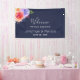 Ein Hochzeitsbanner, der sagt: Willkommen bei unserer Hochzeit mit Ihren personalisierten Namen. Entworfen mit einem hübschen Bouquet von Aquarellfarben-Rose und anderen bunten Flecken, Blätter und Ästen entlang der oberen und unteren Ecken. Set auf einem marineblauen Hintergrund.