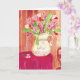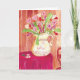 Diese skurrile, herzhafte Karte ist eine schöne Überraschung im Briefkasten. Das Bild ist eine bunte Aquarellmalerei, die einen mit Herzklopfen überfüllten Krug, einen mit rotem Stoff bedeckten Tisch, eine Herztapete und einen herzförmigen Holzstuhl zeigt. Innen: Glücklicher Geburtstag