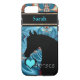 Eine Silhouette eines Pferdes's Kopf auf einem blauen psychedelischen Hintergrund mit einem Aqua/Black-Herz und dem Wort "Pferde&Quot;. Mit einer schwarzen und goldenen Band, die mit Ihrem Namen individuell anpassbar ist. Das perfekte Geschenk für Ihren Pferdefreund.