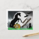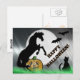 Ein grauer metallischer Hintergrund mit Kürbis, Fledermäusen, schwarzer Silhouette eines Zuchtpferdes und einer Katze. Eine tolle Halloween-Karte für Ihren Pferdefreund!