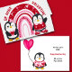Hier ist eine niedliche Valentinkarte für ein Kind, besonders ein Enkel, Sohn oder Tochter. Die Vorderseite ist mit einem farbenfrohen, rosa und rosafarbenen Regenbogen geschmückt, vor dem zwei kleine Pinguine stehend sind. Ein Pinguin trägt einen rosa Haarbogen und hält ein herzförmiges Valentin. Der andere Pinguin trägt eine rote Jacke und die Wellen sind hallo. Der rot gekrümmte Text oben steht "BE MINE VALENTINE". Im Inneren gibt es noch einen kleinen Pinguin, der die Zeichenfolge an einen herzförmigen Ballon hält, und drei Textfelder, die Sie anpassen können.