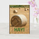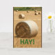 Eine Fotografie einer ländlichen Szene, mit sieben goldenen runden Heuballen auf einem Gebiet, ist das Thema meines "HEUS! Karte des glücklichen Jahrestages". Ich nahm diese Szene entlang der Landschaft von Chilton, Wisconsin gefangen.