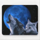 Zwei Wölfe, die an den nächtlichen Himmel heulen, wenn ein großer blauer Mond niedrig hängt.