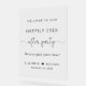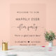 Chic réception de mariage moderne clair signe acrylique avec "Welcome To Our Happily Ever After Party" dans un mélange de typographie simple et un script élégant avec des swashes, "Nous sommes tellement heureux que vous soyez ici", vos prénoms unis par un coeur et votre date de réception. Idéal pour les réceptions après un évènement ou une petite mariage privée.
