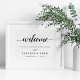 Bienvenue dans votre mariage avec notre affiche chic et douce, disponible en plusieurs tailles. Le design présente une typographie noire sur blanc immaculé avec "bienvenue" en haut dans un élégant script de calligraphie manuscrit, et "...à notre heureux toujours après" et vos noms et mariage datent en dessous de la lettre de bloc classique.