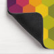 Dieses Design ist ein abstraktes geometrisches Muster, bestehend aus sich wiederholenden Sechsecken, die in engen Reihen und Spalten angeordnet sind und ein Wabengitter bilden. Das Farbschema zeichnet sich durch einen sanften Übergang des Farbverlaufs aus, der durch warme Farbtöne - Gelb, Orangen, Rot - beidseitig flankiert, in coolere, entsalzte Grüntöne und Blues in Richtung Zentrum verblasst. Der visuelle Effekt erzeugt ein Gefühl von Tiefe und Dimensionalität, während die Mittelachse der blassgelben und grünen Farbtöne das Auge nach innen zeichne und der Komposition eine energetische Symmetrie verleiht.