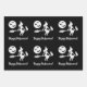 Stilvolles und minimales Halloween-Design mit Desteis Silhouette einer langen Hexenfrau, die auf einem Besenstiel fliegt. Die Hexe trägt ein langes Kleid, Schuhe mit hoher Ferse und einen Hexenhut. Der Mond scheint hinter der Hexe und es fliegen drei Fledermäuse darüber. Eine Katze sitzt auf der Vorderseite des Besensticks. Es gibt auch einen personalisierbaren Textbereich, der jetzt lautet: "Happy Halloween!". Das Design wird sechsmal auf dem Blatt platziert und erzeugt ein kleines Muster.