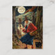 Eine fantastische Vintage Halloween-Geschäftskarte, die eine Hexe geht mit ihrer Katze und Eule durch eine moonlit Nacht kennzeichnet.