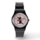 Diese Uhr hat eine Hexenkatze in Silhouette, die auf einem roten Pentagramm in einem roten Kreis auf einem hellgrauen Hintergrund nach einem goldenen Stern sucht.