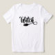 Dieses Schwarzweiß-Design enthält das Wort "Hexe" in einem fettgedruckten, fließenden Script-Schriftart, wobei sich das Schwanz-Ende des Buchstabens "h" in den Griff eines Broomsticks verwandelt. Der Text ist mit einem spielerischen, handgeschriebenen Look stilisiert und fügt dem Gesamtthema eine skurrile Touch hinzu. Um das Wort herum gibt es verstreute Sterne, die einen magischen, sternenbedeckten Effekt erzeugen, der das witzige Thema verstärkt. Der diagonal unter dem Text positionierte Broomstick fügt dem Design ein dynamisches Element hinzu, das Bewegung anregt und Tiefe hinzufügt.