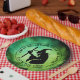 Papierteller mit einer schwarzen Silhouette einer alten Hexe, die einen Kessel auf schwarz-grünem Hintergrund umrüttelt, mit eigenem Text um die Hexe.