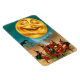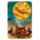 Ein lustiger Vintager, flexibler Halloween-Magnet mit einer Hexengruppe, die unter dem strahlend lächelnden Mond um einen Jack O'Lantern tanzt. com