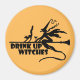Design mit dem Sprichwort "Drink up Hexen" mit einer Hexe auf einem Besen mit einer Katze und einem Martini.