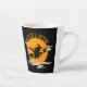 Fun Halloween Design für Teeliebhaber. Hexe auf einem Besen mit einer Tasse Tee, der sich durch einen orangefarbenen Mond und Wolken zieht.