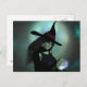 Eine lächelnde, ganz schwarz gekleidete Hexe mit einem hohen schwarzen Hut wirft einen leuchtenden orbischen Zauber.