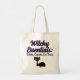 Die Tasche ist ideal für Ihre freundliche Hexe. Ein lustiges Design mit einer schwarzen Retro-Katze mit großen gelben Augen, die unter der witzigen Schrift sitzen. Über der Katze in einem lila Schriftart mit einer schwarzen Kontur sind die Worte "Hexenessentials" und darunter die Worte "Tränke, Kristalle, Katzen-Leckereien" in einem schwarzen Text.