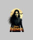 Stilisierte Abbildung einer geheimnisvollen Hexe, die unter einem glühenden Vollmond stehend ist, mit umherfliegenden Fledermäusen und einer spitzigen 'Happy Halloween'-Nachricht.