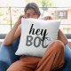 Modernes und niedliches Halloween-Kissendesign mit Wohngestaltung "Hey Boo" und schwarz, grau und weiß geprägtem Schriftzeichen mit einem kleinen Geisterakzent.