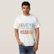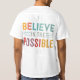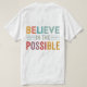 Der T - Shirt enthält eine kühne und ermutigende Botschaft: "Glaube an das Mögliche". Der Text wird in einem mehrfarbigen Schema dargestellt, wobei jedes Wort eine andere lebendige Farbe hat. Dies schafft ein dynamisches und inspirierend Design, das Aufmerksamkeit erregt.
