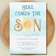Mit dieser niedlichen Sonnendusche laden Familienmitglieder und Freunde zu einer sonnigen Babydusche ein. Es enthält den Text "Here Comes The Son" in blauer Retro-Typografie mit einer niedlichen gelben Aquarellsonne auf blauem Himmelshintergrund. Einfach anpassbare Original Watercolor © Michele Davies.