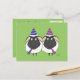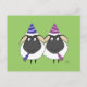 Postkarte mit zwei bezaubernden Schafen in Party Hüten mit Hörnern. Auf der Rückseite der Postkarte steht: "Hier sind zwei neue Glückwünsche!" Der Hintergrund wird als grüne Farbe angezeigt, aber er und der Schriftart und die Phrase können leicht an das angepasst werden, was man möchte.