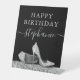 Elegante und schicke Moderne Silber und Black Happy Geburtstag Personalisierte Tafelschild mit Chic und Elegant Imitate Glitzer Silver High Heel Stiletto Schuhe und individuelle Name Kalligraphie Skript kursiv in Schwarz-Weiß.