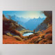 Öllandschaft Gemälde im Stil von Roger Dean einer Frau, die in einer Gebirgskette hoch wandert und in einer üppigen Bucht am Teich anhält. Mit generativen Algorithmen und Fotoshop erstellt. Das ist ein weiteres 100% originelles Schnürhammer Design.