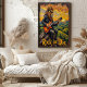Dieses dynamische Kunstwerk stellt einen Löwen dar, der mühelos in Sonnenbrillen und einer Lederjacke cool aussieht, meisterhaft eine E-Gitarre "zerkleinert" und dabei auf einem Felsen steht. Die Szene entfaltet sich über sanfte grüne Hügel und weit entfernte Bäume unter einem riesigen, feurigen Sonnenuntergang Himmel. Das dicke, ausdrucksstarke Impasto schafft eine greifbare Textur, wodurch die "Rock or Die"-Deklaration mit der Rohenergie der Performance Resonanz findet.