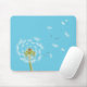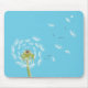 Die Blume aus blau-weiß-weiß-weiß-blauen Leuchtern mit einem Kunstdesign einer wilden Dandelion-Blume, die vor einem stilvollen, himmelblauen Hintergrund im Wind weht. Whimsical und niedlich.