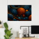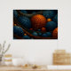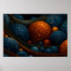 Ein faszinierendes digitales Kunstwerk mit leuchtenden blauen und orangefarbenen Kugeln, eingebettet in wirbelnde, bandförmige Strukturen. Die Komposition erinnert an eine fantastische Welt oder mikroskopische Welt, reich an Textur und Tiefe. Ideal für Liebhaber abstrakter Kunst, kosmischer Themen und lebendiger visueller Erzählkunst.