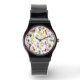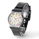 Ein buntes Armgesicht mit festlichem Party-Ambiente und farbenfrohen Konfetti-Werfen über Weiß. Die schwarzen Zahlen sind eine Vorlage, die Sie entfernen/löschen können. Wählen Sie Ihr Uhrenband "Style" und "Color" unter Optionen.