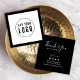 Stilvolle Beipackkarte mit Ihrem Logo vor einem weißen Quadrat mit einer bearbeitbaren Randfarbe (klicken Sie auf "Anpassen" und ändern Sie die Hintergrundfarbe, um die Randfarbe von "Schwarz" in eine Farbe Ihrer Wahl zu ändern) auf der Vorderseite und "Vielen Dank" im modernen Kalligrafieschrift mit der Erholung Ihrer sozialen Medien und Web-Informationen auf der Rückseite. Sie können die Hintergrundfarbe auch ändern, indem Sie auf den Hintergrund klicken. Personalisieren Sie es, indem Sie den Platzhalter-Text und das Platzhalter-Bild durch Ihr eigenes Logo ersetzen. Für weitere Optionen, wie zum Beispiel den Schriftart zu ändern, ist es die Größe und Abstand zwischen den Buchstaben klicken Sie auf die Schaltfläche "Anpassen". *Bitte beachten Sie, dass das Zazzle-Wasserzeichen, das in der Zoomvorschau angezeigt wird, NICHT auf dem gedruckten Endprodukt erscheint. © Rosewood and Citrus