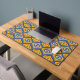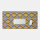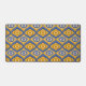 Hippie-Schreibtischmatte mit psychedelischen Augenmustern indigoblau und honeycomb gelb Farben. Dieses spaßige eklektische, sonderbare Muster ähnelt aufgrund seiner geometrischen Formen dem zeitgenössischen Stil der Mitte des Jahrhunderts.