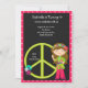 Fangen Sie Ihre Feier mit dieser Hippie-Geburtstagseinladung der entzückenden Mädchen an. sie hat ein großes Limones grünes Friedenszeichen mit farbigen Blumen auf der Seite sie. Nahe bei ihr ist ein niedliches Mädchen mit dem langen braunen Haar. Sie hat ein farbiges Krawatten-Shirt mit zusammenpassendem Stirnband. Es gibt eine Pinkgrenze mit weißen Tupfen um eine schwarze Mitte. Karo heraus die vielen anderen Entwürfe und die Produkte in dieser Linie. ©JW Illustrationen